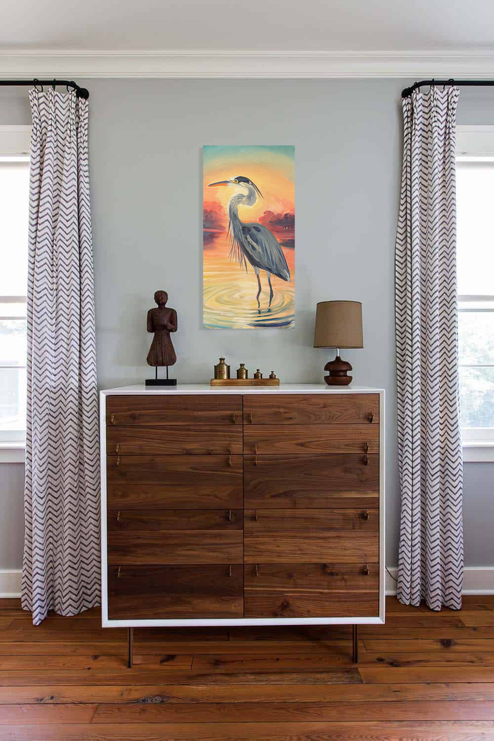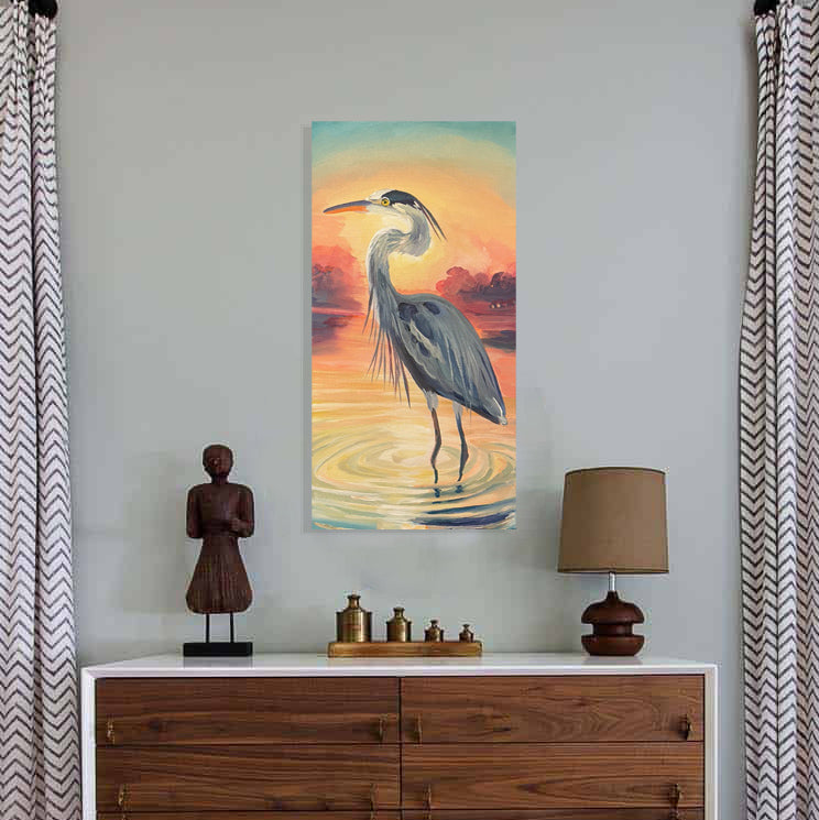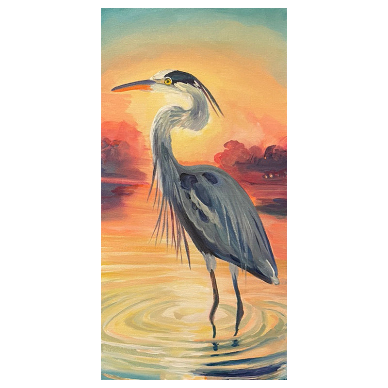 This Blue Heron at Sunset is a 10x20" original acrylic painting by Krissy Whiski