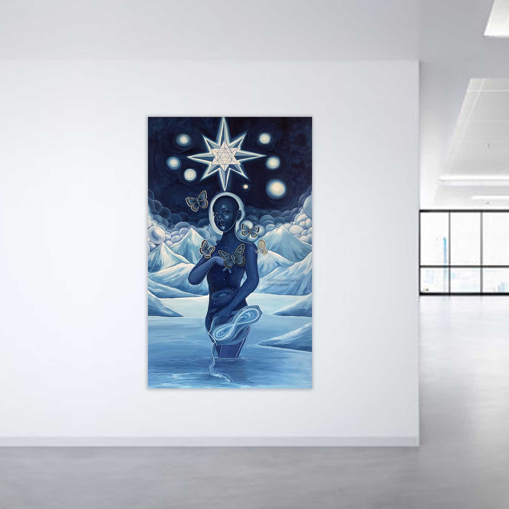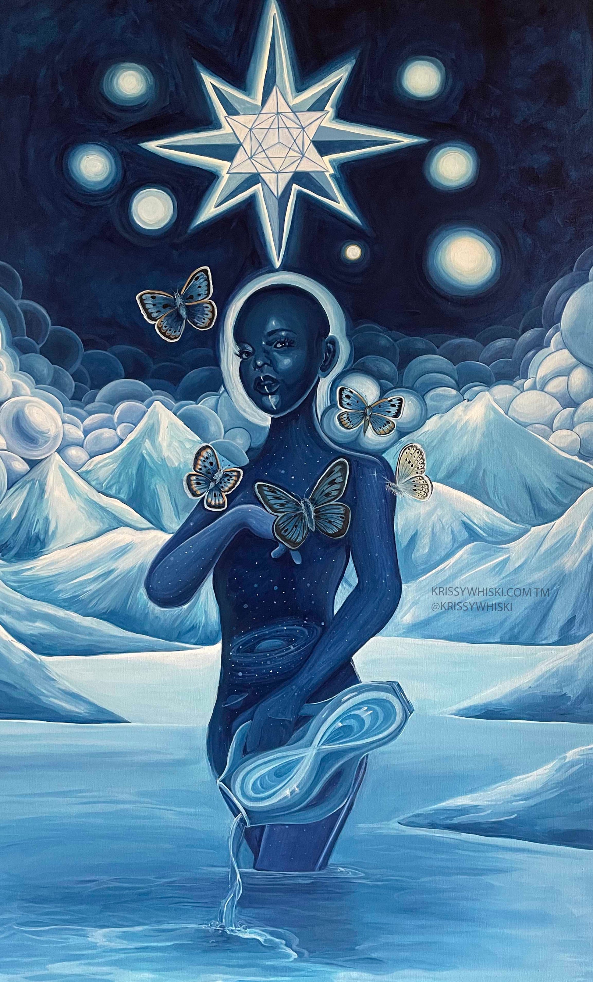 A goddess stands in a shimmering pond at the base of the mountains. Above her, a large star dominates the night sky, surrounded by seven small stars that are meant to symbolize the seven chakras. 5 butterflies perch, representing transcendence from the physical to the higher planes. The woman has within her the universe, she slowly pours from a pitcher of water bearing the infinity symbol, symbolizing that even if the water is taken from this larger body, it will in time return again as part of the whole.