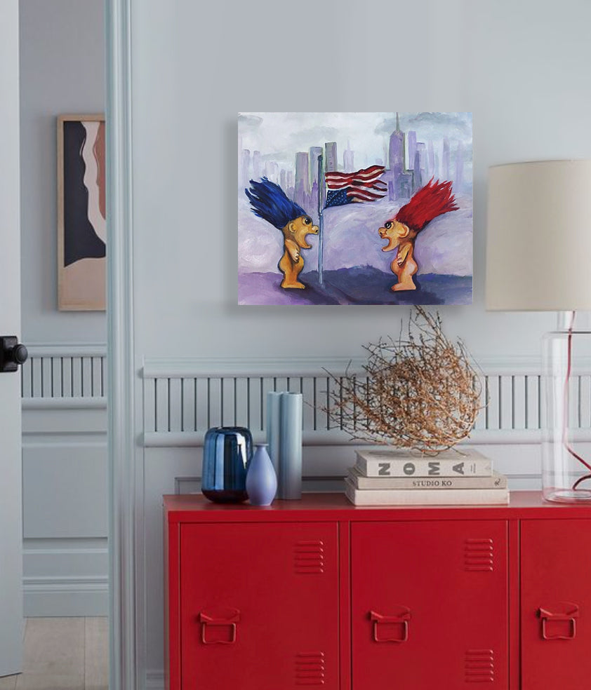Divided We Fall Trolls is an original 16x20" acrylic painting by Krissy Whiski. Optional frame (pictured) comes with the painting at no additional cost as this painting is a thin mounted canvas and would look best framed.