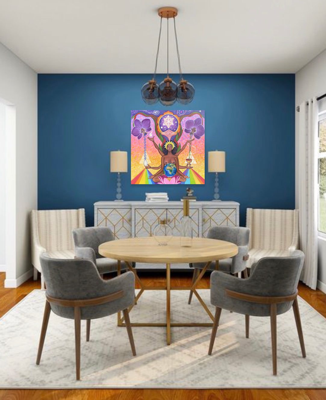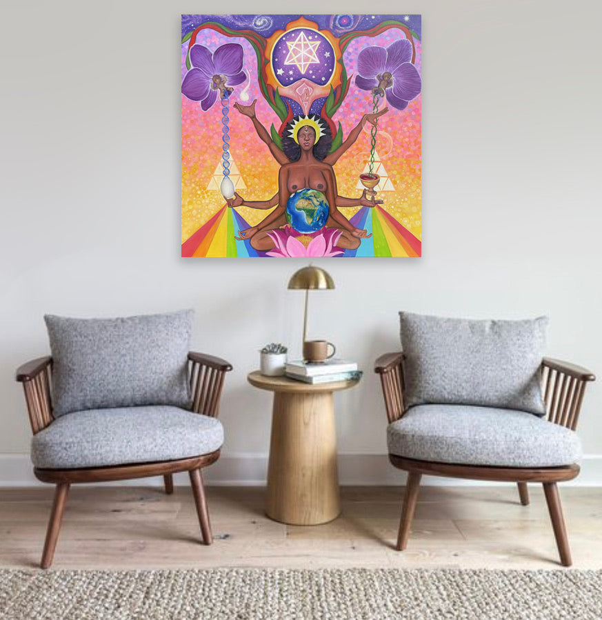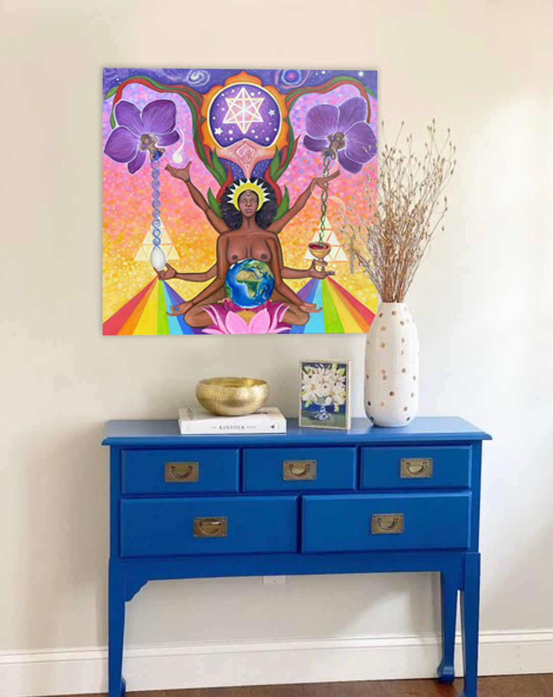 Divine Creatrix is a 30x30" original acrylic painting on 1.5" deep gallery wrapped canvas.