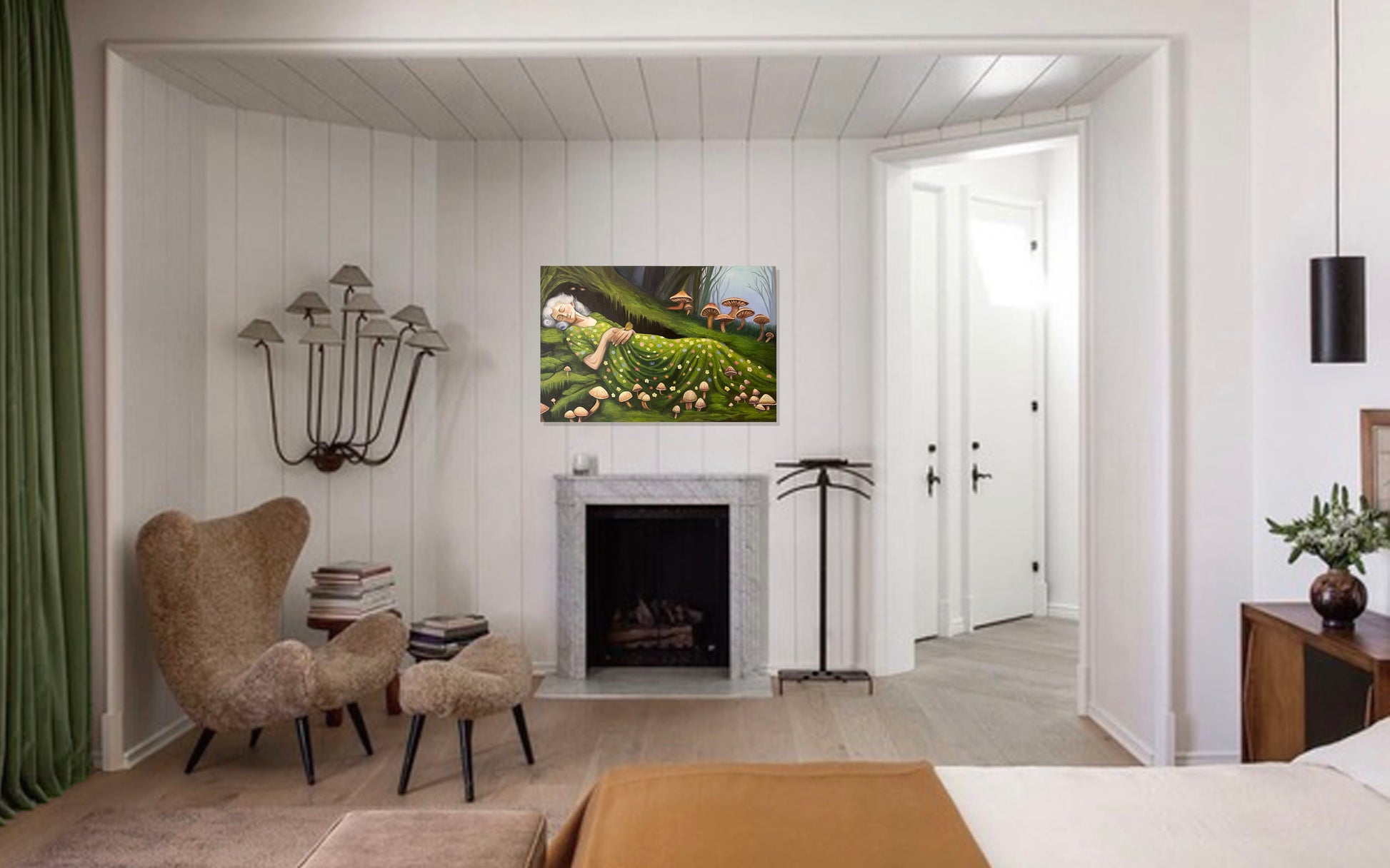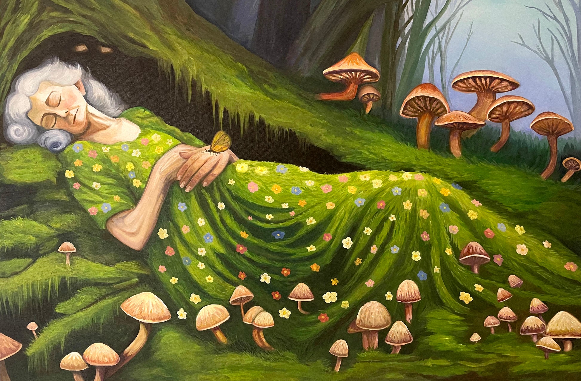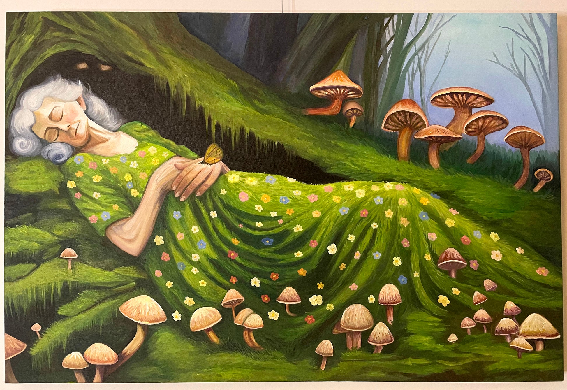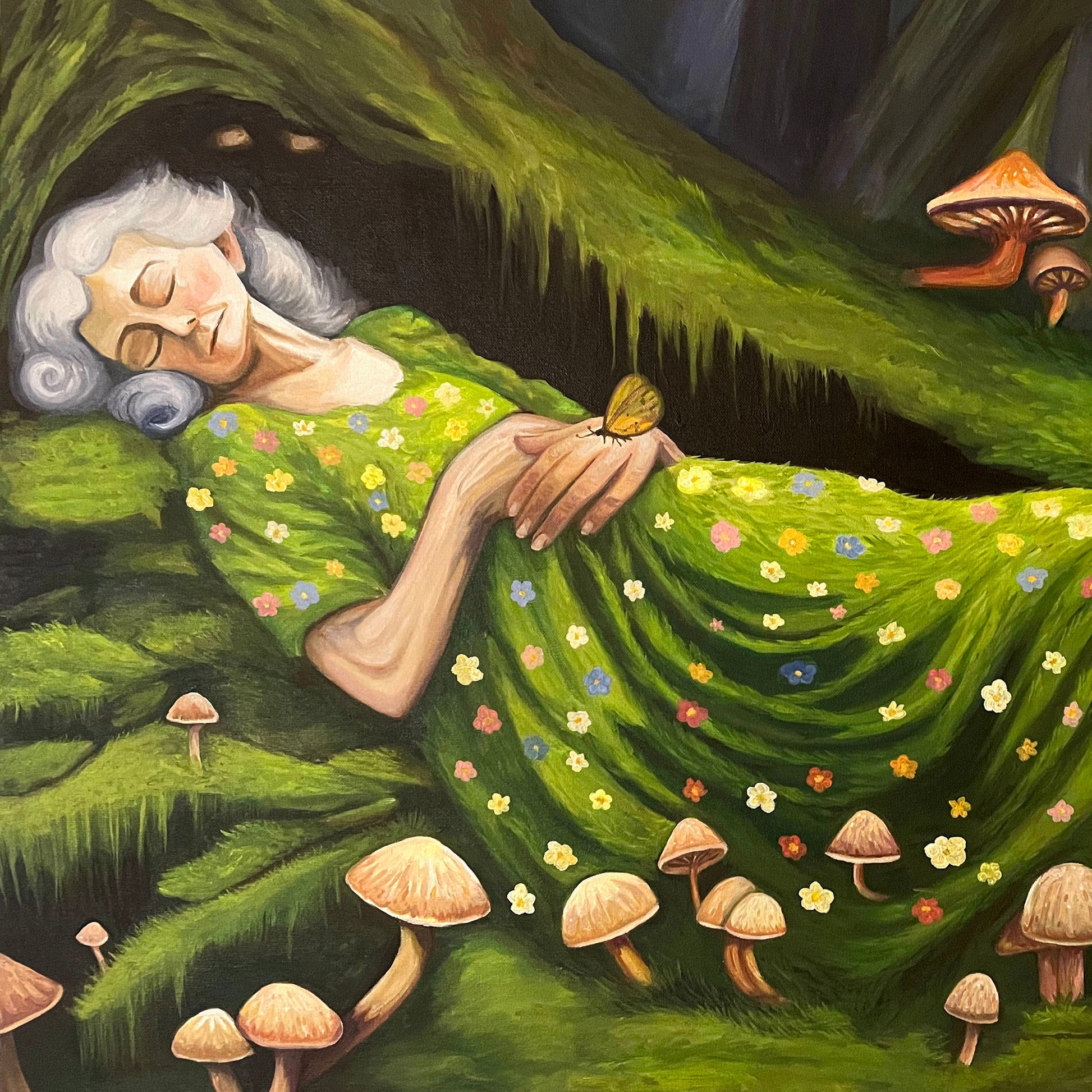 This piece is a meditation on aging, mortality, decay, and the unending cycles of nature. In creating this painting, I aimed to capture the tranquility, beauty and grace, inherent in the natural progression of aging, death, and decay—a journey shared by all living beings. The figure of a woman, seamlessly returning to the natural world, embodies the theme of impermanence. Her closed eyes suggest the imminence of death, while her serene smile reveals her peaceful acceptance of this journey.