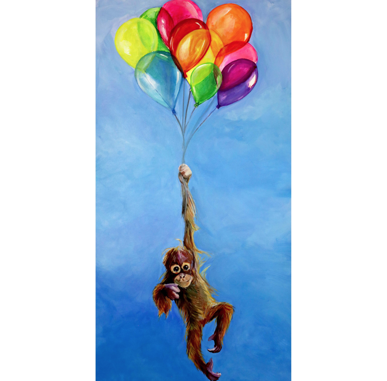 Monkey with Balloons is an original "20x40" acrylic on canvas painting by artist Krissy Whiski.