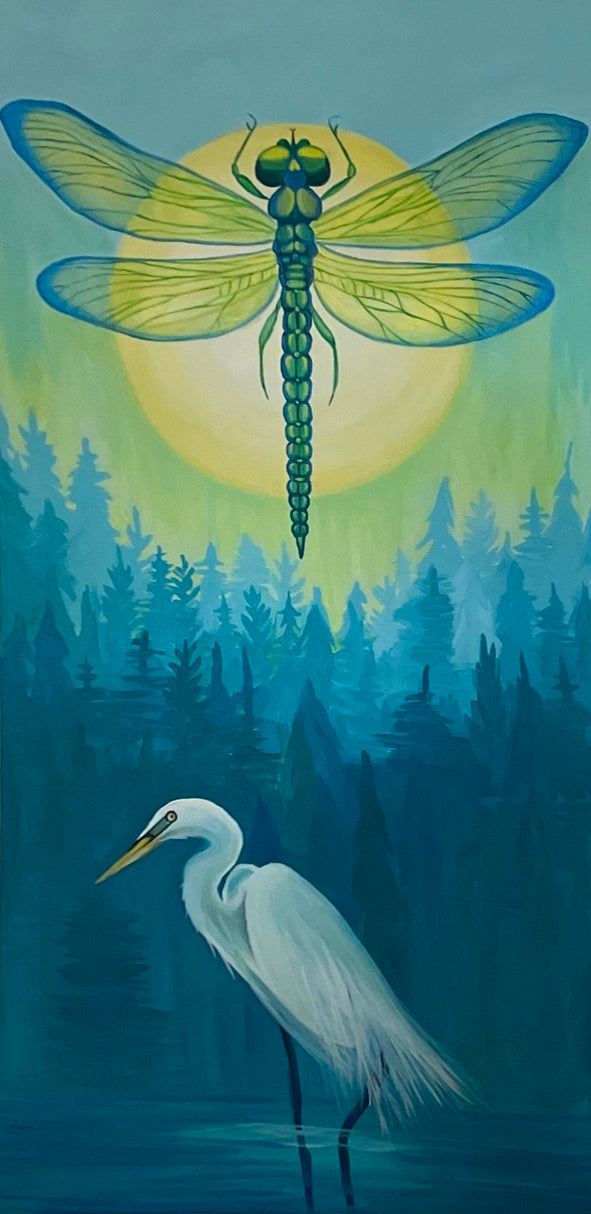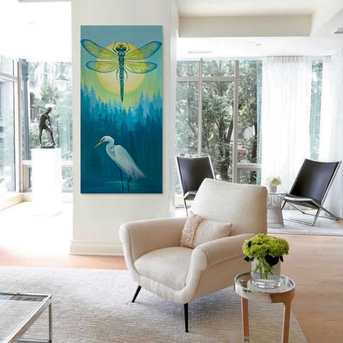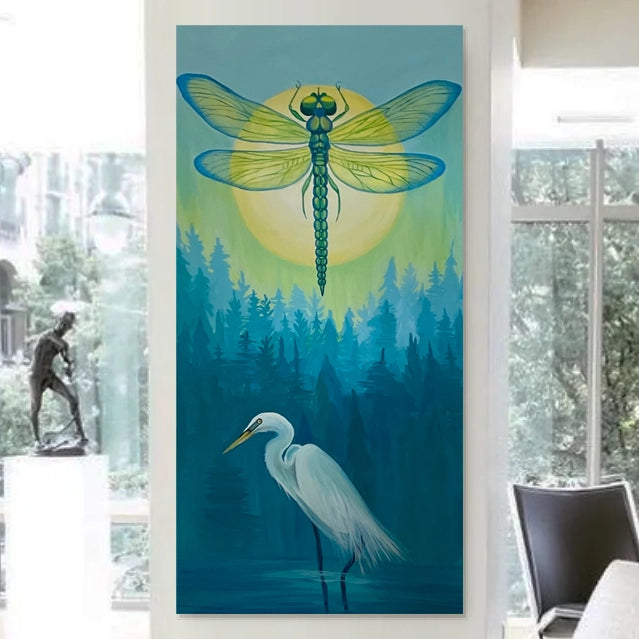 Blue Serenity is an original painting that captures the quiet magic of a peaceful bay at dawn. A delicate blue dragonfly hovers before the rising sun, while a graceful white egret stands watch below, reflected in cool, tranquil waters. Inspired by the stillness of nature’s edges, this piece invites you to pause, breathe, and feel the gentle harmony of air, light, and water. Hand-painted in soothing blue tones, Blue Serenity was inspired by the beauty of nature for someone who loves nature, dragonflies, egrets, sunrises, and sunsets.